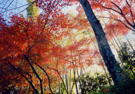 目に入ってくるのは、青い空・緑色の竹林・そして真っ赤に染まった紅葉。