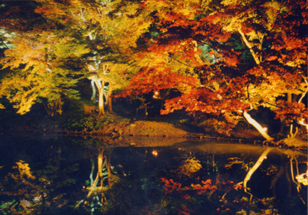 光に照らされ、漆黒の夜空に浮かび上がる紅葉。